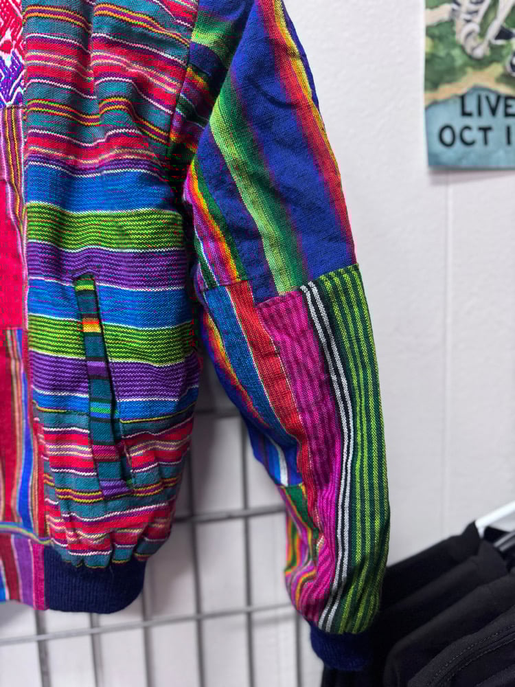 Size Small/Medium bomber jacket, made in Guatemala. Reall great shape on this jacket, it is reccomended to wash sparingly or hand wash cold and hang to dry. Tagged medium but could be on the smaller size so i have it listed as a S/M. Any questions feel free to reach out via IG @dyesbyroobs